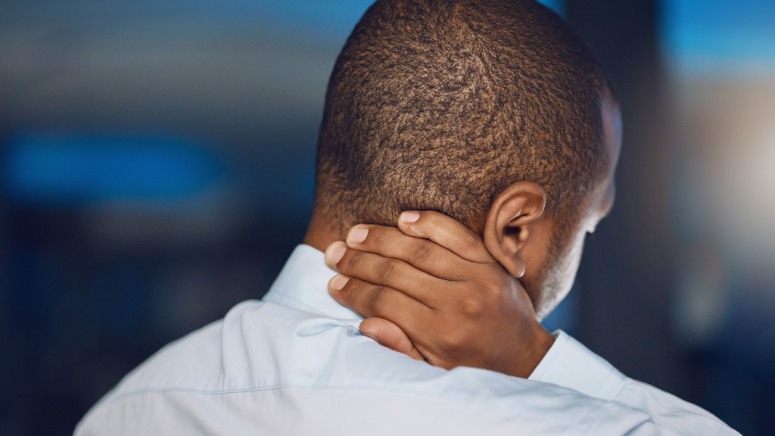 Legenda: Homem segura a região do pescoço em sinal de dor, simbolizando a importância de reunir documentos para solicitar fibromialgia aposentadoria no INSS.